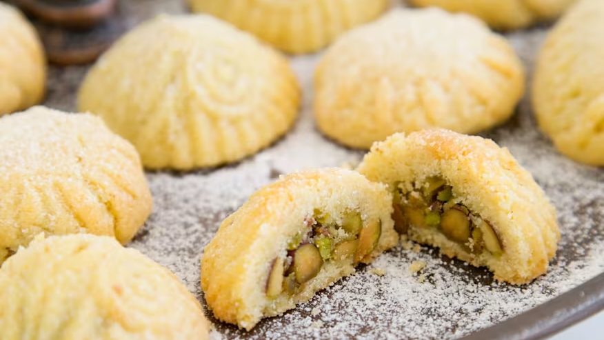 Ma’amoul sind traditionelle Mürbeteigkekse, die im Nahen Osten zu Weihnachten und Ostern gebacken werden. Die kunstvoll geformten Kekse werden mit Dattelpaste, gehackten Pistazien oder Walnüssen gefüllt.